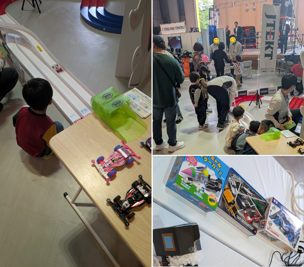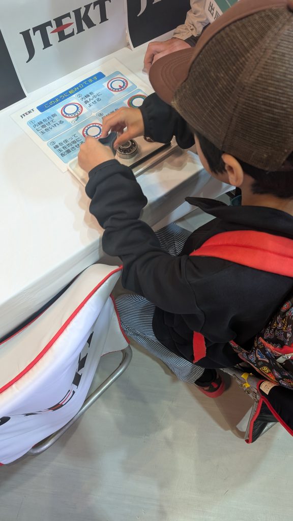 当社のブースでは、ミニ四駆コース走行、ベアリング組み立て体験、製品展示等を行い、ショー全体の来場者数が5,000人を超える活況の中、当社ブースにもたくさんの親子連れの方々に来場いただきました。